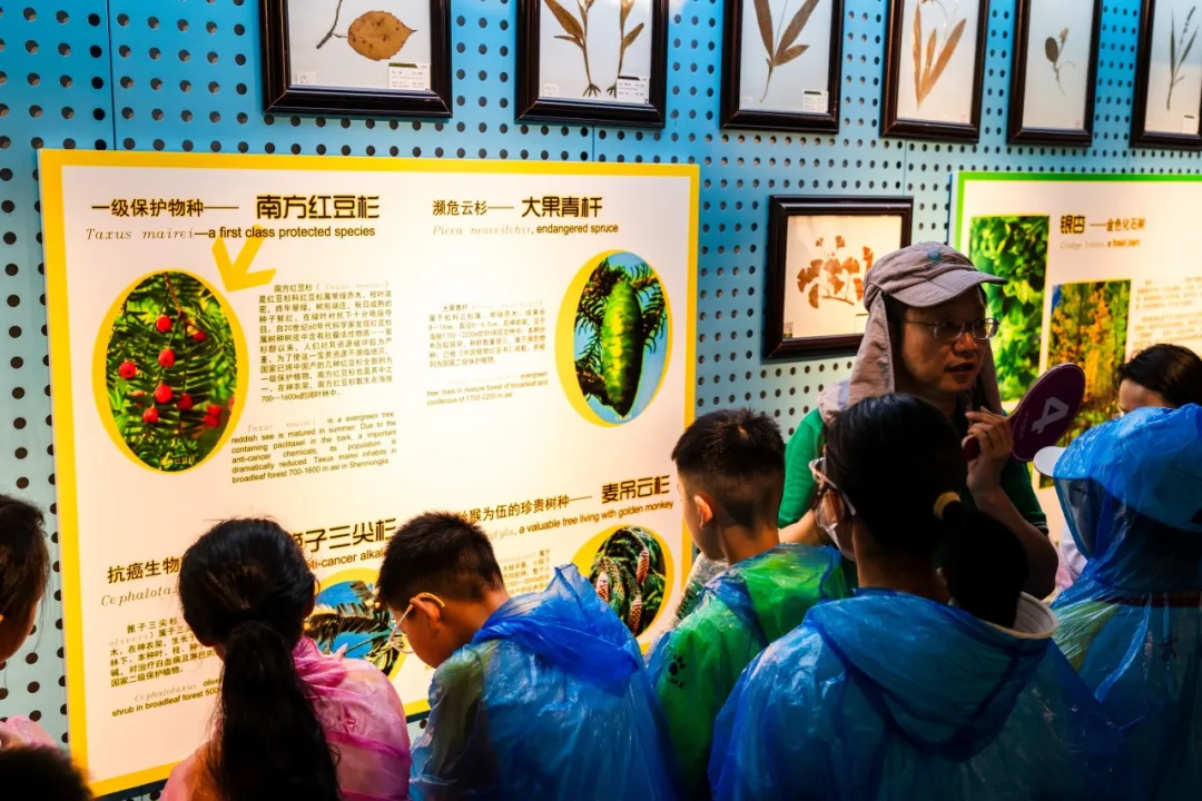 而在神农架大型科普基地「官门山生态科普景区」,科考老师开启小课堂,教孩子们辨认神农架特有的动植物标本。