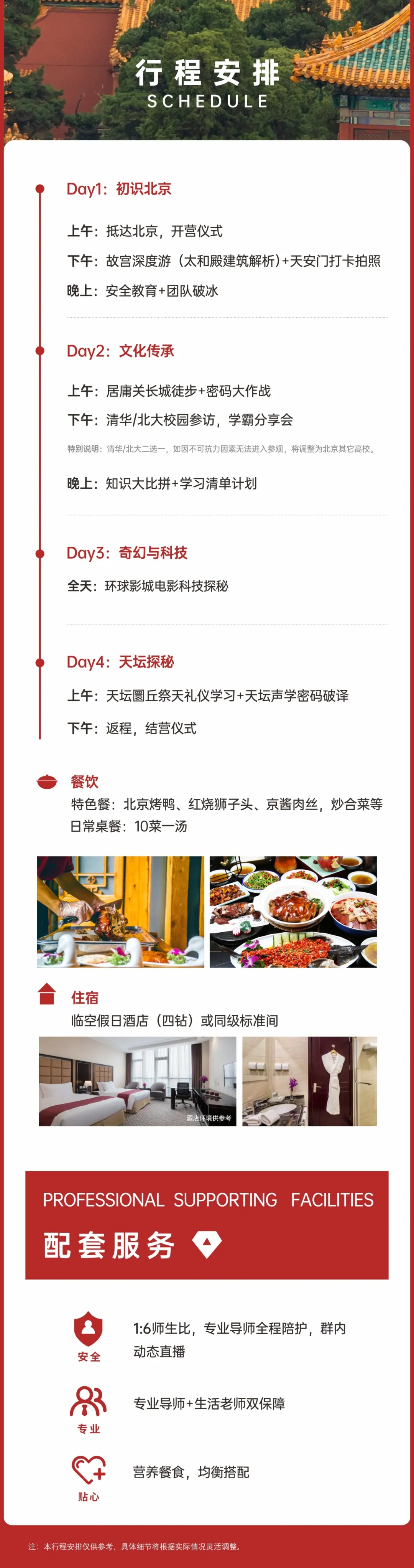 我们有最安心的后勤保障,当地特色餐顿顿不重样,4钻酒店标间独立卫浴每日消杀,1:6师生配比,每6名孩子就配有1名导师全天候守护——专业团队持急救证上岗,每晚查房同步当日成长日志。