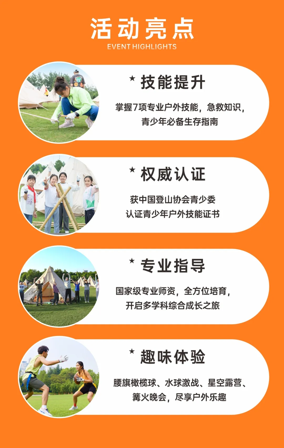 儿童视角设计增强代入感,趣味中让孩子重建与大自然的连接,激发孩子们的好奇心和探索欲,收获中国登山协会青少委认证青少年户外技能证书,打造户外全能少年。
