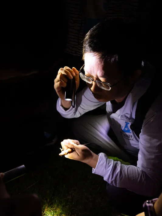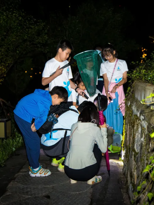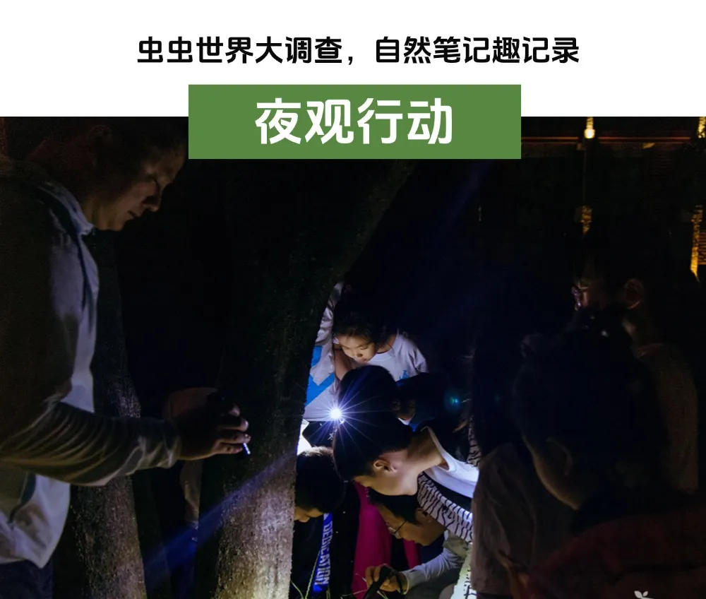 在漆黑的夜晚,跟随老师的引导「夜观行动」,在夜幕下打开感官,静静聆听、仔细感受,循光探索,寻访丰富的夜间生物世界。