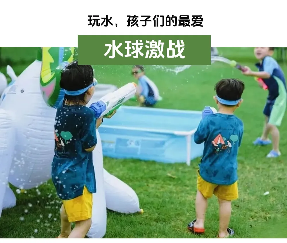 夏日来一场激情的「水球激战」,孩子们全副武装,背上超酷的水枪,你追我赶,装水、喷水一气呵成,找准对手主动进攻。