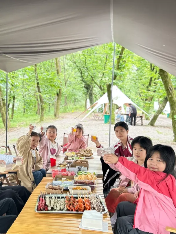 孩子们围坐在精心布置的烧烤区旁,亲手翻动着滋滋作响的烤串,香气四溢,亲手烤制食物,享受户外烹饪的乐趣,同时也培养了他们的动手能力和独立性。