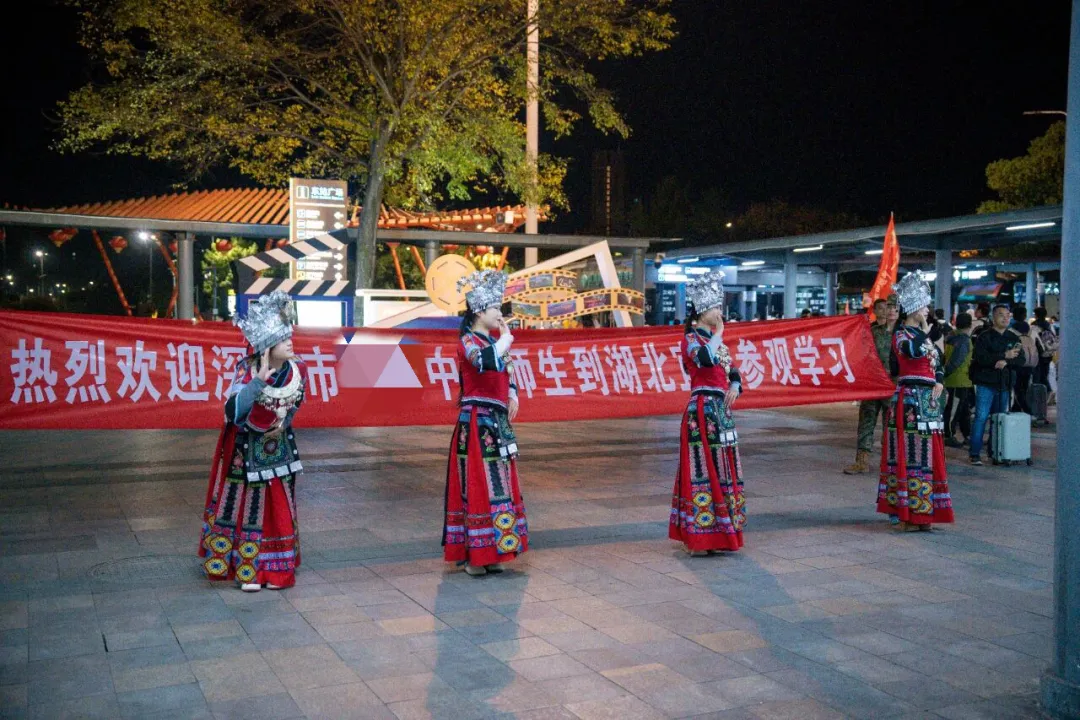 六百余名师生陆续走出站台,看到的是早已准备就绪的清晰车贴、行进动线,以及站台外四位身着民族服饰的土家族演员——他们以一段质朴热情的歌舞,向师生致以第一声问候。