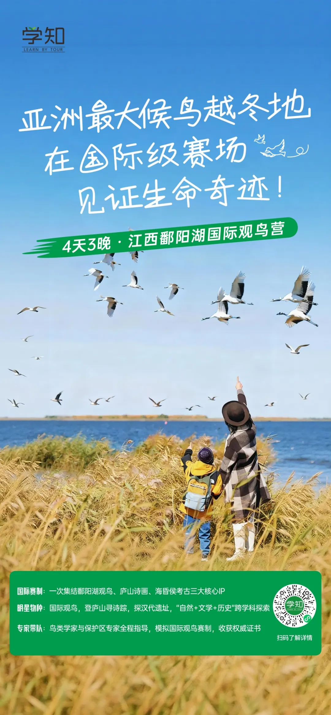 成千上万只来自北方的候鸟在湖面同时起飞,这里是国际观鸟圈公认的顶级现场。孩子还将体验一次按国际观鸟大赛机制设计的观测挑战,并获得专业证书。