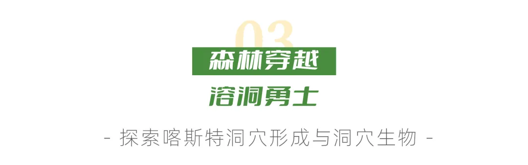 洞穴穿越,一路见证“树抱石”“绞杀”“石上森林”等自然现象,穿越九洞天,探索喀斯特洞穴形成与洞穴生物,幸运的话还能捡拾到“洞穴珍珠”。