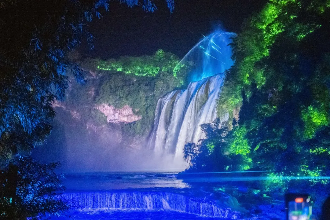 避开白天的人挤人。让我们沉浸在夜晚「黄果树」的独特之美中,伴随民族音乐的响起,绚丽多彩的灯光与远山近景相映成趣。